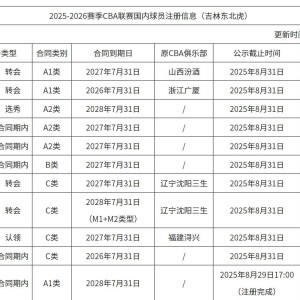 北京时间8月30日,CBA官网更新了内援注册名单,新疆男篮在这次注册中注册了14名球员。在目前名单中,新疆男篮队中只有阿...