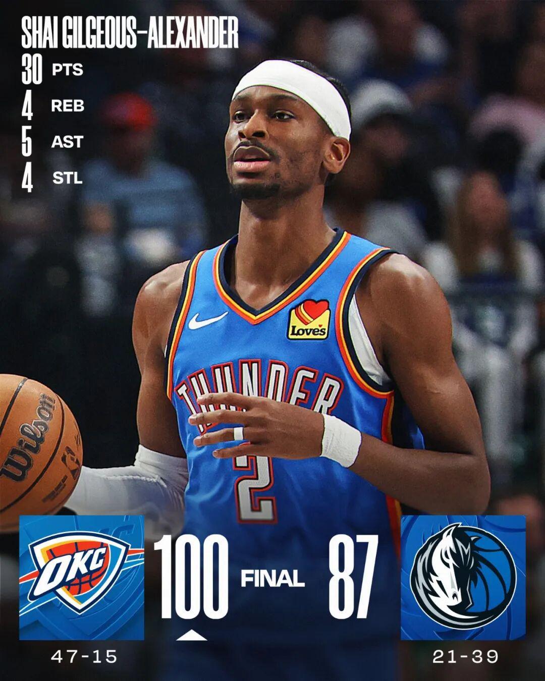 常规赛,雷霆客场100-87战胜独行侠。